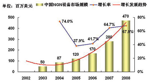 對于中國NGN市場規(guī)模的預(yù)測,主要取決于各個運(yùn)營商在NGN方面的戰(zhàn)略發(fā)展重點(diǎn),以及重點(diǎn)的投資方向?傮w上來說,從2003年起,以IPTV、VOIP、寬帶接入等業(yè)務(wù)為代表的NGN的部分業(yè)務(wù)的推廣,使得事實(shí)上中國已經(jīng)形成一定的NGN的市場規(guī)模,盡管這一市場規(guī)模仍然很小。2004年中國的NGN基礎(chǔ)設(shè)備的市場規(guī)模超過8千萬美元,以后隨著各個運(yùn)營商N(yùn)GN戰(zhàn)略的進(jìn)一步清晰,這一部分的投資會保持持續(xù)穩(wěn)定的增長,2005~2008年以后的NGN設(shè)備投資規(guī)模的平均增長率可以達(dá)到50%。