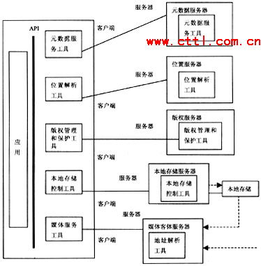 在DAVIC1.5AnytimeAnywhere文件中所規(guī)定的模型如圖2所示。在該圖中沒有描述任何與網(wǎng)絡(luò)相關(guān)的內(nèi)容。僅規(guī)定出在客戶端設(shè)備和服務(wù)器端設(shè)備中應(yīng)當(dāng)包含的功能模塊。即:元數(shù)據(jù)服務(wù)、位置解析、版權(quán)管理和保護(hù)、本地存儲(chǔ)控制、媒體服務(wù)。其基本思想為,在服務(wù)器端提供的所有功能。在客戶端設(shè)備中應(yīng)包含有相關(guān)的軟件工具。在業(yè)務(wù)的具體實(shí)施過程中,客戶端首先向服務(wù)器端請(qǐng)求幫助查找其感興趣的媒體內(nèi)容,由元數(shù)據(jù)服務(wù)器處理并返回相關(guān)信息。通過位置解析服務(wù)器來確定客戶端所選擇的媒體內(nèi)容所在的位置;經(jīng)過媒體管理和保護(hù)服務(wù)器的認(rèn)可:由本地存儲(chǔ)服務(wù)器向用戶提供媒體信息同時(shí)允許客戶端對(duì)媒體信息進(jìn)行控制。