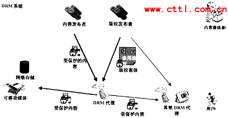 如圖4所示,DRM系統(tǒng)主要負(fù)責(zé)將內(nèi)容發(fā)布者發(fā)布的信息與版權(quán)發(fā)布者發(fā)布的信息組合起來將內(nèi)容變?yōu)槭鼙Wo(hù)的內(nèi)容,由版權(quán)客體提供使用規(guī)則,用戶在使用內(nèi)容時(shí)需要首先從DRM代理處根據(jù)使用規(guī)則獲得使用受保護(hù)內(nèi)容的密鑰,然后使用所獲得的密鑰對(duì)受保護(hù)的內(nèi)容進(jìn)行解碼并使用。