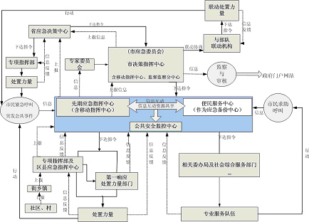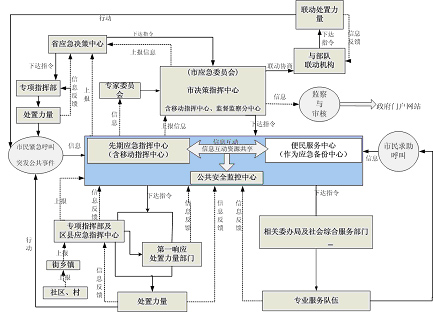 指政府決策指揮中心、先期指揮中心、便民服務(wù)中心、公共安全監(jiān)控中心,通常還有移動指揮中心和災(zāi)備中心,以及其它節(jié)點(diǎn)的建設(shè)。一般地,先期指揮中心與便民服務(wù)中心可互為備份。政府決策指揮中心對重大、特別重大突發(fā)公共事件進(jìn)行協(xié)調(diào)、決策,偏重于自然災(zāi)害與生產(chǎn)安全方面,而一般、較重突發(fā)公共事件仍保持由各專業(yè)指揮部指揮、處置,只有當(dāng)跨區(qū)、跨機(jī)構(gòu)需要協(xié)調(diào)時(shí)由政府決策指揮中心進(jìn)行協(xié)調(diào)。
