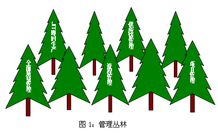 用“叢林”一詞來形容目前管理方法的林立,并沒有夸張的成份。在這片叢林中,許許多多根深葉茂的“參天大樹”不斷產(chǎn)生。許多專家學者把注意力集中于管理的某一方面,如質(zhì)量管理、流程再造、項目管理、供應鏈管理等都體現(xiàn)了不同的管理視角。不同管理方法在理論緣由上相互促進、相互影響,他們以各自不同的方式和視角描繪了管理的不同側面。