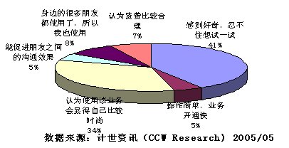 彩鈴是移動(dòng)運(yùn)營(yíng)商語(yǔ)音增值業(yè)務(wù)的一個(gè)重要增長(zhǎng)點(diǎn)。計(jì)世資訊(CCW Research)數(shù)據(jù)顯示:2004年的彩鈴業(yè)務(wù)銷售(包括信息費(fèi)與通信費(fèi))增長(zhǎng)371.4%,達(dá)到9.9億元人民幣;2005年繼續(xù)保持152.2%的高速增長(zhǎng),達(dá)到25億元,2006年上半年已經(jīng)超過(guò)了30億元人民幣。在這些數(shù)字背后是公眾對(duì)彩鈴的熱情和追捧。圖1用戶使用彩鈴的主要原因