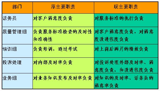 首先,要根據(jù)組織的目標來確定我們需要哪些流程,即需要哪些流程才能保證組織目標的實現(xiàn);其次,根據(jù)流程的需要,即為了保證流程的有效運行,來劃分不同部分的職責;最后,根據(jù)各部分職責的劃分來設置組織的架構。如我們根據(jù)客服中心流程運行的需要,對組織架構和相關班組的主要職責進行了調整,以保證流程的有效順暢運行。如部分班組的主要職責調整如下: