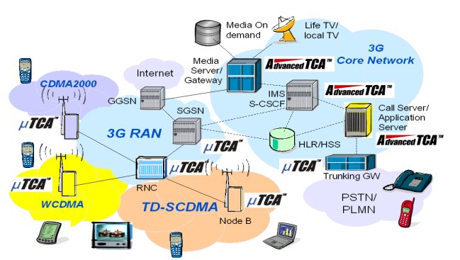 3G網(wǎng)絡中占主要地位的三個無線接入標準是WCDMA、TD-SCDMA與CDMA2000。3GPP與業(yè)界廠商對網(wǎng)絡結構的標準化做出的杰出努力,為在世界范圍內(nèi)成功布署3G網(wǎng)絡業(yè)務起到了至關重要的作用。不過,3G網(wǎng)絡是復雜的系統(tǒng),包含有多種多樣的網(wǎng)元設備,AdvancedTCA與MicroTCA技術的出現(xiàn)把它的實現(xiàn)方式引向了標準化的道路,即通過商用組件快速、低成本地布署3G網(wǎng)絡,減少了各種獨立的實現(xiàn)方式的復雜性,提高了互操作性。 圖 1: 3G 網(wǎng)絡結構