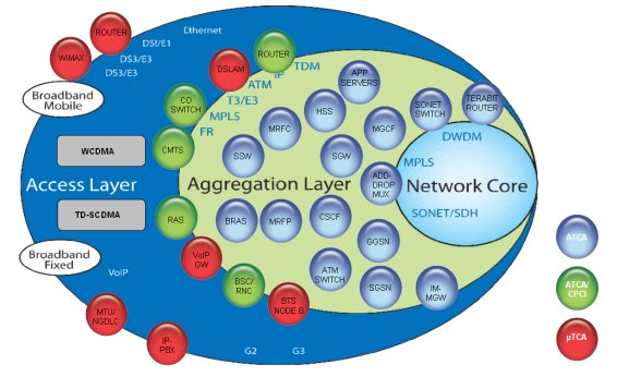 在匯聚層與核心網(wǎng),對高可用性、傳輸容量與事務處理能力要求很高。ATCA通常是高性能的最佳選擇。mTCA與ATCA可對電信網(wǎng)中要求的操作性與高可用性提供與生俱來的支撐,而其它IT技術卻做不到。ATCA與mTCA作為一種系統(tǒng)技術,是電信級業(yè)務與商用組件之間自然而然的選擇。