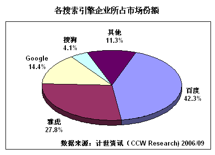 互聯(lián)網(wǎng)上的信息浩如煙海,是典型的信息爆炸,因此絕大多數(shù)網(wǎng)民都必須依靠搜索引擎才能找到所需信息,這個(gè)龐大的需求也就注定了搜索引擎市場(chǎng)的興旺繁榮。計(jì)世資訊(CCW Research)數(shù)據(jù)顯示:2004年中國(guó)的搜索引擎市場(chǎng)銷(xiāo)售總額達(dá)到9.4億元人民幣,增長(zhǎng)67.9%,2005年繼續(xù)保持47.9%的增長(zhǎng)速度,達(dá)到13.9億元,到2006年預(yù)計(jì)這個(gè)數(shù)字將突破20億元大關(guān)。