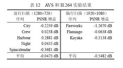 profile的客觀編碼性能。結(jié)果為相同碼率條件下峰值信噪比PSNR的增益?梢钥闯,AVS相對于MPEG-2標(biāo)準(zhǔn)編碼效率平均提高2.56dB,相比于H.264標(biāo)準(zhǔn)編碼效率略低,平均有0.11dB的損失。