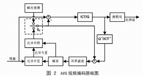 AVS視頻標(biāo)準(zhǔn)定義了I幀、P幀和B幀三種不同類型的圖像,I幀中的宏塊只進(jìn)行幀內(nèi)預(yù)測,P幀和B幀的宏塊則需要進(jìn)行幀內(nèi)預(yù)測或幀間預(yù)測,圖中S0是預(yù)測模式選擇開關(guān)。預(yù)測殘差進(jìn)行8×8整數(shù)變換(ICT)和量化,然后對量化系數(shù)進(jìn)行zig-zag掃描(隔行編碼塊使用另一種掃描方式),得到一維排列的量化系數(shù),最后對量化系數(shù)進(jìn)行熵編碼。AVS視頻標(biāo)準(zhǔn)的變換和量化只需要加減法和移位操作,用16位精度即可完成。
