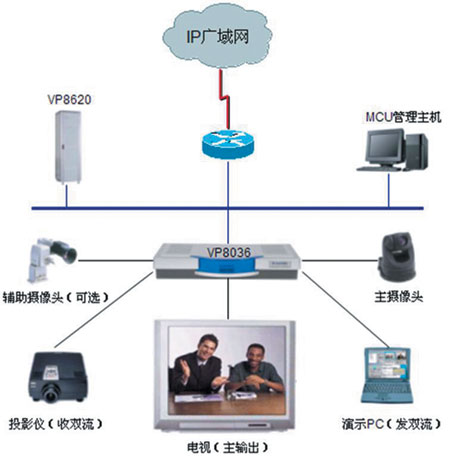 一般我們建議在電視會議室配置兩臺帶S-Video端子或者復(fù)合端子的電視機或者背投,一臺用于顯示遠(yuǎn)端會場畫面,一臺用于顯示本端會場畫面。電視機尺寸可根據(jù)會場大小來選擇。另外我們還建議在會場布置一臺高分辨率投影儀,用于顯示雙流畫面(PC畫面)。