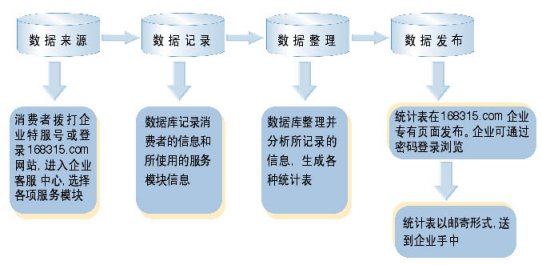 "企業(yè)客戶服務(wù)系統(tǒng)"統(tǒng)計(jì)數(shù)據(jù)分析功能,能幫助企業(yè)管理人員適時(shí)監(jiān)控"企業(yè)客戶服務(wù)系統(tǒng)"的運(yùn)行情況,自動(dòng)采集消費(fèi)者在使用"企業(yè)客戶服務(wù)系統(tǒng)"過程的相關(guān)數(shù)據(jù),并分類整理成數(shù)據(jù)庫,為企業(yè)經(jīng)理人投資決策提供重要的數(shù)據(jù)支持。企業(yè)經(jīng)理人只需登陸客戶服務(wù)網(wǎng)站www.168315.com,按照"168315客戶服務(wù)中心"提供的用戶名和密碼登錄,即可隨時(shí)下載"企業(yè)客戶服務(wù)系統(tǒng)"的運(yùn)行數(shù)據(jù),瀏覽客戶檔案庫。也可以由"中心"的服務(wù)人員將統(tǒng)計(jì)結(jié)果通過E-mail、傳真或郵寄的方式送到企業(yè)經(jīng)理人手中,如下圖: