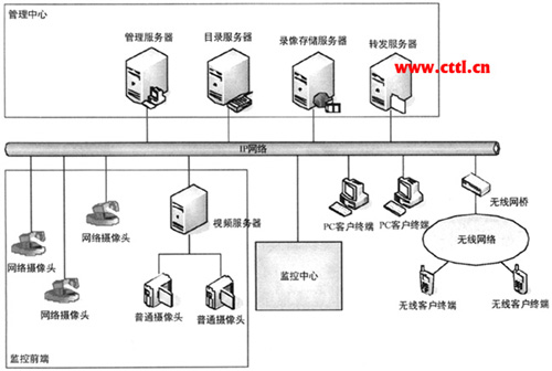圖中管理中心和監(jiān)控前端、監(jiān)控中心是視頻監(jiān)控系統(tǒng)的組成部分,無線網(wǎng)絡(luò)部分則是視頻監(jiān)控和其他系統(tǒng)互通的一個示例。當然視頻監(jiān)控系統(tǒng)和其他業(yè)務(wù)網(wǎng)絡(luò)共同使用時,也可能會融為一體。