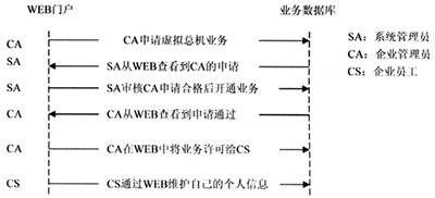 虛擬總機(jī)系統(tǒng)開(kāi)戶(hù)流程采用WEB方式實(shí)現(xiàn),以此完成用戶(hù)對(duì)虛擬總機(jī)業(yè)務(wù)的定購(gòu)、系統(tǒng)管理員對(duì)用戶(hù)開(kāi)戶(hù)申請(qǐng)的審核、用戶(hù)業(yè)務(wù)參數(shù)的控制等操作,最后企業(yè)員工可以在企業(yè)管理員許可業(yè)務(wù)后,登陸WEB門(mén)戶(hù)管理個(gè)人信息。具體流程如圖2所示。