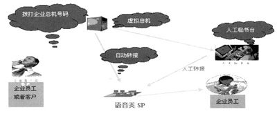 步驟五:如果用戶(hù)不知道員工分機(jī)號(hào)碼或者希望了解其他信息,主叫用戶(hù)可以選擇接入人工秘書(shū)臺(tái)。此時(shí)人工秘書(shū)臺(tái)會(huì)依據(jù)被叫號(hào)碼檢索出被呼叫集團(tuán)的信息,同時(shí)根據(jù)主叫號(hào)碼檢索出主叫用戶(hù)是否為企業(yè)內(nèi)部員工或者企業(yè)客戶(hù),同時(shí)將這些信息同步更新到人工秘書(shū)臺(tái)上,話務(wù)員根據(jù)這些信息可以完成作為企業(yè)特色話務(wù)員的服務(wù)工作;