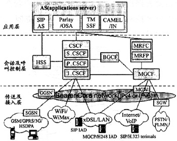 一般IMS分為三層,應(yīng)用層支持各類應(yīng)用服務(wù)器,負(fù)責(zé)為用戶提供增值業(yè)務(wù)和第三方業(yè)務(wù)。會(huì)話及呼叫控制層負(fù)責(zé)管理呼叫或會(huì)話設(shè)置,其中呼叫會(huì)話控制模塊CSCF完成呼叫網(wǎng)關(guān)功能、呼叫業(yè)務(wù)觸發(fā)功能和路由選擇功能,將SIP信令消息正確地轉(zhuǎn)發(fā)到應(yīng)用服務(wù)器。歸屬用戶服務(wù)器HSS用于維護(hù)每個(gè)終端用戶獨(dú)有的業(yè)務(wù)屬性,包括IP地址、漫游信息、好友列表、呼叫業(yè)務(wù)定制信息及語(yǔ)音郵件設(shè)置等。HSS是全網(wǎng)可用資源。媒體資源功能MRF包括MRFP和MRFC,負(fù)責(zé)提供及控制媒體流資源,如播放通知音、媒體流的混合、編解碼等。媒體網(wǎng)關(guān)控制MGCF負(fù)責(zé)PSTN承載與IP流之間的連接,根據(jù)被叫號(hào)碼和來(lái)話情況選擇CSCF,并完成PSTN與IMS之間的呼叫控制協(xié)議轉(zhuǎn)換,如將從CSCF接收到的SIP消息轉(zhuǎn)換為MEGACO或ISUP消息,并通過IP發(fā)送到信令網(wǎng)關(guān)SGW。出口網(wǎng)關(guān)控制功能BGCF主要實(shí)現(xiàn)呼叫路由功能,為呼叫選擇適當(dāng)?shù)腜STN接口點(diǎn),若發(fā)現(xiàn)該接口點(diǎn)與自己在同一網(wǎng)絡(luò),則選擇本網(wǎng)絡(luò)的MGCF與PSTN交互,若發(fā)現(xiàn)接口點(diǎn)在另一網(wǎng)絡(luò)時(shí),BGCF將會(huì)話信令轉(zhuǎn)發(fā)給另一網(wǎng)絡(luò)相應(yīng)的BGCF。一個(gè)IMS可以包含一個(gè)或多個(gè)CSCF、HSS、MGCF等功能模塊。傳送及接入層承載各種類型之間的轉(zhuǎn)換,完成與傳統(tǒng)PSTN/PLMN間的互通等功能,包括各類有線接入、無(wú)線接入、互聯(lián)互通網(wǎng)關(guān)等設(shè)備。