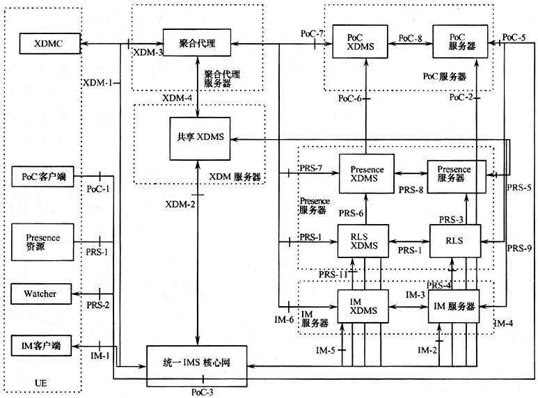 OMA雖然定義了XDM、Presence(呈現(xiàn))、Instant Message和PoC等業(yè)務的功能實體和參考點,但是為了在網(wǎng)絡中實現(xiàn)以上業(yè)務,需要將OMA定義的功能實體和參考點映射成物理實體和協(xié)議,確定運營商開放此類業(yè)務對設備和協(xié)議的要求,圖2給出了一種映射的方式。XDM服務器包含的共享XDMS功能提供公共群組的能力,有利于用戶在使用PoC、IM等業(yè)務時也能共享此群組。