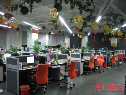 整個服務(wù)現(xiàn)場的裝修以桔黃色為主色調(diào),代表溫暖、和諧;格局不規(guī)則化,盡顯現(xiàn)代時尚的風(fēng)格;辦公室到處是綠色植物,墻上貼滿了各種相片、海報和宣傳語,天花板掛滿了激勵口號板;別具特色的洗手間文化;乒乓球室、休息室、休閑吧,咖啡機(jī)、茶葉、果汁、雪糕、飲料,魚缸、大液晶電視、音響……一點感覺不到這是一個枯燥的呼叫中心的工作環(huán)境。