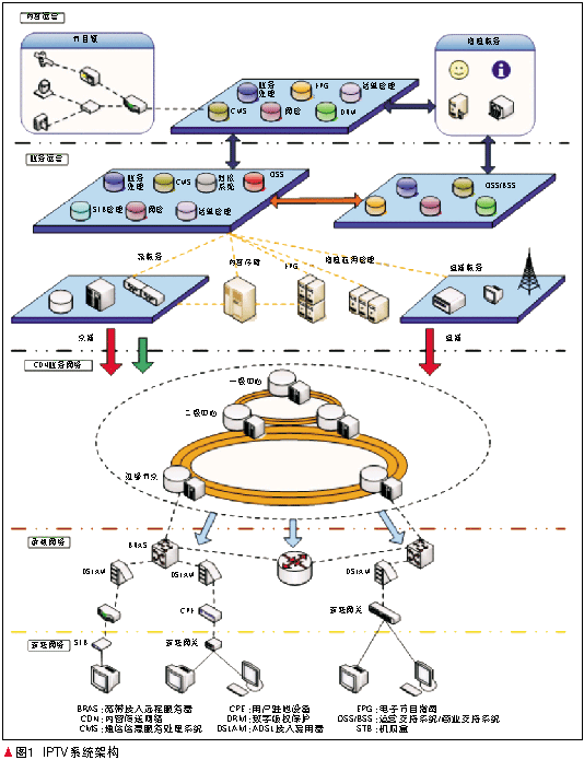 圖1所示為IPTV系統(tǒng)架構。IPTV通用系統(tǒng)的邏輯結(jié)構由內(nèi)容運營平臺、業(yè)務運營平臺、內(nèi)容傳送(CDN)業(yè)務網(wǎng)絡、承載網(wǎng)絡、家庭網(wǎng)絡5部分所構成。