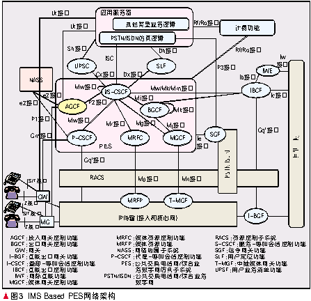 IMS Based PES網(wǎng)絡架構如圖3所示。IMS Based PES系統(tǒng)在IMS架構的基礎上新增接入網(wǎng)關控制功能(AGCF)實體,其他實體均與IMS原有實體對應,但在功能上有差異和擴展。傳統(tǒng)的終端和/或訪問節(jié)點通過媒體網(wǎng)關(MG)和網(wǎng)關(GW)接入公共交換電話網(wǎng)/綜合業(yè)務數(shù)字網(wǎng)仿真子系統(tǒng)(PES)。
