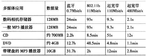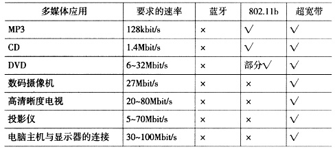 2.0接口相當,遠遠高于無線局域網802.11b的11 Mbit/s,也比下一代無線局域網802.11a/g的54 Mbit/s高出近一個數量級。UWB通信的功耗較低,能更好地滿足使用電池的移動設備的要求。另外,UWB信號的功率譜密度非常低,信號難以被檢測到,再加上采用的跳頻、直接序列擴頻等擴頻多址技術,使非授權者很難截獲傳輸的信息,因而安全性非常好。表1是一些典型的實時多媒體應用對不同無線傳輸技術的數據傳輸速率的要求。從表中可以看出,如果采用無線的方式來進行傳輸,只有UWB技術可以滿足各種應用的要求。