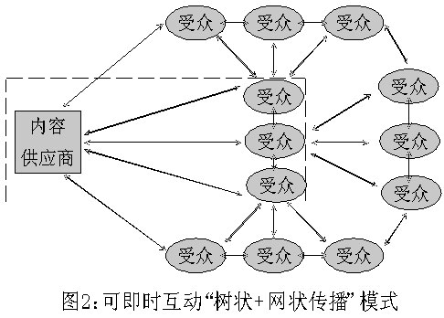 我們認(rèn)為,手機(jī)短信新聞的傳播方式,是“樹狀+網(wǎng)狀傳播”,即由新聞內(nèi)容提供方完成點(diǎn)到面的“樹狀傳播”后,信息接受終端又可以完成一個(gè)“網(wǎng)狀傳播”。因此,手機(jī)短信新聞,不僅傳播鏈較長(zhǎng),而且可以相互交錯(cuò)形成網(wǎng)狀互動(dòng),“傳者”和“受者”可以隨時(shí)出現(xiàn)“角色互換”。(見圖2)