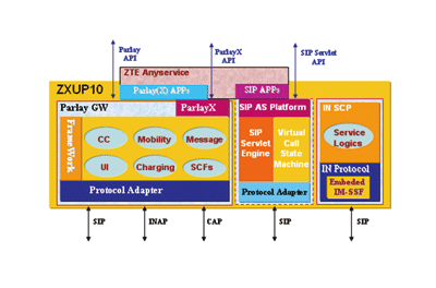 ZXUP10作為開放業(yè)務(wù)平臺(tái),包括Parlay網(wǎng)關(guān)和SIP應(yīng)用平臺(tái),對外提供標(biāo)準(zhǔn)的Parlay/ParlayXAPI和SIPServletAPI,屏蔽底層網(wǎng)絡(luò)的差異性,第三方通過調(diào)用標(biāo)準(zhǔn)接口,快速生成Web等方式的第三方應(yīng)用,帶來業(yè)務(wù)開發(fā)、提供模式的重大改變。