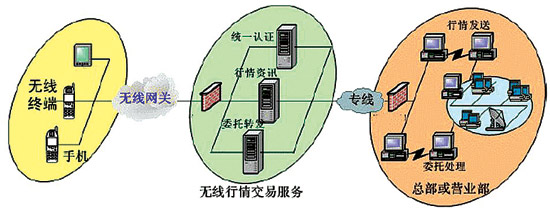從技術(shù)上說(shuō),“移動(dòng)交易廳”主要采用WAP及專用手機(jī)客戶端方式,客戶可以通過訪問證券公司專門申請(qǐng)的域名(如廣發(fā)證券公司的http://wap.gf.com.cn),鏈接到證券公司的WAP手機(jī)炒股系統(tǒng)服務(wù)器,下載手機(jī)客戶端軟件,然后通過無(wú)線接入網(wǎng)關(guān)登錄到移動(dòng)證券業(yè)務(wù)平臺(tái)。移動(dòng)證券業(yè)務(wù)平臺(tái)的行情及委托交易系統(tǒng)完全利用現(xiàn)有的網(wǎng)上交易系統(tǒng)的資源。