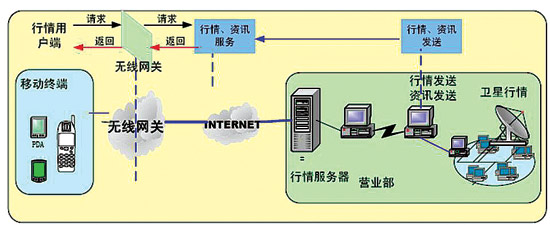 無(wú)線終端的請(qǐng)求通過各無(wú)線網(wǎng)絡(luò)進(jìn)入移動(dòng)證券系統(tǒng)的無(wú)線接入網(wǎng)關(guān),經(jīng)無(wú)線網(wǎng)關(guān)轉(zhuǎn)發(fā)至移動(dòng)交易行情服務(wù)平臺(tái)。如果是讀取行情資訊,行情服務(wù)平臺(tái)直接提供行情資訊服務(wù);如果是進(jìn)行委托交易,由委托接入服務(wù)器將委托數(shù)據(jù)轉(zhuǎn)發(fā)到總部或營(yíng)業(yè)部,再由總部或營(yíng)業(yè)部交易處理服務(wù)平臺(tái)進(jìn)行處理。換句話說(shuō),在無(wú)線網(wǎng)關(guān)接入后,其后的委托服務(wù)、行情服務(wù)都可采用現(xiàn)有的網(wǎng)上交易的通道和系統(tǒng)。