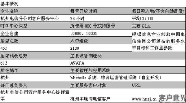 浙江省電信有限公司杭州市分公司客戶服務(wù)中心(以下簡(jiǎn)稱杭州電信客服中心,或者杭州電信10000號(hào))成立于2002年9月,是一個(gè)基于CTI技術(shù)、充分利用通信網(wǎng)和計(jì)算機(jī)網(wǎng)絡(luò)的綜合信息服務(wù)系統(tǒng),以電話為主,輔之以傳真、短信、Email、互聯(lián)網(wǎng)等多種接觸媒體,通過人工、自助語音與網(wǎng)上服務(wù)的方式,為杭州400萬電信客戶提供綜合電信業(yè)務(wù)的咨詢、查詢、受理、投訴、報(bào)障和電話營銷。建有2130路中繼通道,1410路自動(dòng)語音通道,186個(gè)人工服務(wù)座席、189個(gè)電話營銷座席、80個(gè)外包座席,占地5600多平米,分別位于杭州市惠興路9號(hào)和慶春路133號(hào)。