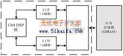 (1)存儲(chǔ)結(jié)構(gòu):DM642的存儲(chǔ)器系統(tǒng)由片內(nèi)內(nèi)存L1、L2和片外外存兩部分組成,L1,L2和片外SDRAM構(gòu)成了整個(gè)存儲(chǔ)器系統(tǒng)的三級(jí)層次結(jié)構(gòu),如圖2所示。其中,片內(nèi)內(nèi)存采用兩級(jí)緩存結(jié)構(gòu),第一級(jí)由L1P和L1D組成,L1距離DSP核最近,數(shù)據(jù)訪問速度最快,只需一個(gè)時(shí)鐘周期,只能作為不能尋址的Cache使用。第二級(jí)L2是一個(gè)統(tǒng)一的程序/數(shù)據(jù)空間,可以整體作為SRAM映射到存儲(chǔ)空間,也可以整體作為第二級(jí)Cache,或是二者按比例進(jìn)行組合。第三級(jí)是片外外存,一般由SDRAM構(gòu)成。L1Pcache大小為16KB,直接映射,每行大小32
