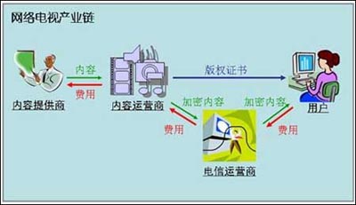 摘要:IPTV已經(jīng)成為廣電和電信行業(yè)共同的熱點。本文簡略地分析了建設(shè)IPTV系統(tǒng)中的若干關(guān)鍵的技術(shù)問題—數(shù)字內(nèi)容保護、內(nèi)容分發(fā)網(wǎng)絡(luò)等,并且展望了IPTV發(fā)展的美好前景。圖1 網(wǎng)絡(luò)電視產(chǎn)業(yè)鏈?zhǔn)疽鈭D