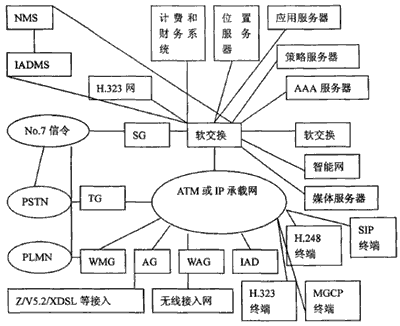 第三代移動(dòng)通信系統(tǒng)是在第二代移動(dòng)通信技術(shù)的基礎(chǔ)上,引入了通用分組無(wú)線業(yè)務(wù)技術(shù)及軟交換等重要技術(shù)演進(jìn)而來(lái)的。它具有諸多優(yōu)點(diǎn),可以支持多媒體業(yè)務(wù),在不同的陸地?zé)o線業(yè)務(wù)接入網(wǎng)有成熟的漫游協(xié)議,可以為不同的用戶提供連續(xù)的業(yè)務(wù)支持。但是它也有缺陷:在數(shù)據(jù)傳輸蜂值時(shí),傳輸速率低。而以802.11標(biāo)準(zhǔn)為主的WLAN具有高傳輸帶寬(802.11系列標(biāo)準(zhǔn)能提供1~54Mb/s的數(shù)據(jù)傳輸速率)性能。不過(guò)它的缺點(diǎn)也很明顯,每個(gè)接入點(diǎn)的覆蓋范圍不大,只能適用于公司、旅館、機(jī)場(chǎng)等所謂的“熱點(diǎn)”地區(qū)。而且不同WLAN業(yè)務(wù)提供商之間的網(wǎng)絡(luò)沒(méi)有漫游協(xié)議。本文結(jié)合第三代移動(dòng)通信系統(tǒng)和無(wú)線局域網(wǎng)的優(yōu)缺點(diǎn)互補(bǔ)的特點(diǎn),提出將兩者互通的方案,使現(xiàn)有的無(wú)線局域網(wǎng)資源在未來(lái)能夠發(fā)揮更大的作用,使未來(lái)的通信網(wǎng)絡(luò)更加完善。圖1 軟交換網(wǎng)絡(luò)體系結(jié)構(gòu)