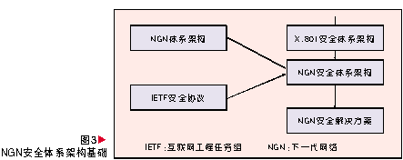 “Security Consideration”章節(jié)。本文對NGN安全基礎(chǔ)[6-8]、 NGN安全需求[2-9]、安全體系架構(gòu)[10-14]、安全機制[15-17]進行了研究,為我國NGN的研究和部署提供有益的參考。