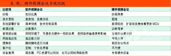 與傳統(tǒng)的硬件視頻會議系統(tǒng)相比較,軟件視頻會議系統(tǒng)可以利用現(xiàn)有的網(wǎng)絡環(huán)境和計算機設備,并能夠提供不遜色于硬件系統(tǒng)的音視頻質量和更為豐富的數(shù)據(jù)協(xié)作功能; 同時,物美價廉的系統(tǒng)投資和靈活方便的配置也是軟件視頻會議產(chǎn)品非常引人關注的優(yōu)勢。