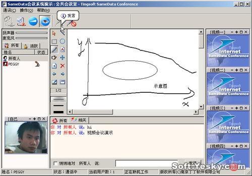 可以看到該系統(tǒng)提供了多路視頻展示與共享文檔顯示區(qū)、文本交流、文檔共享、語音交流等多種交互手段,各用戶可以在主席的協(xié)調(diào)下使用各項功能輕松地實現(xiàn)實時交流與網(wǎng)絡(luò)協(xié)作。