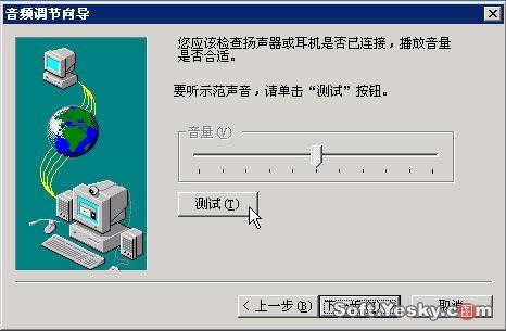 單擊“下一步”跳過Netmeeting服務(wù)器設(shè)置,此時向?qū)髮τ嬎銠C聲卡和麥克風進行測試,如圖5。