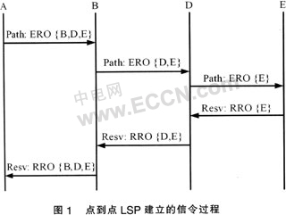 Switching Path)建立的信令過程。當(dāng)入口標(biāo)記交換路由器(LSR:Label Switching Router)A接收到一個業(yè)務(wù)請求后,它根據(jù)路由控制模塊計算出來的路由填寫顯示路由對象(ERO:Explicit