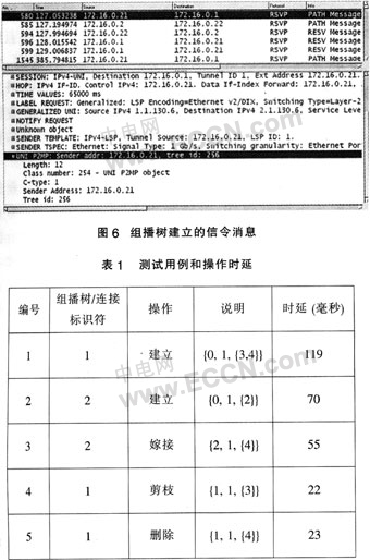 1出發(fā)的組播樹和單播連接,結(jié)果如表1所列。圖6顯示了Ethereal捕獲的組播樹建立的信令消息。在解開的Path消息中,可以發(fā)現(xiàn)經(jīng)過擴展的UNI組播對象。然后,對已存在的連接進(jìn)行了動態(tài)的修改。在第三個測例中,一個葉子被添加到單播連接上并使其變?yōu)橐豢媒M播樹。在嫁接和剪枝的操作中,業(yè)務(wù)生成器在已建立的連接上沒有觀察到丟包的現(xiàn)象。