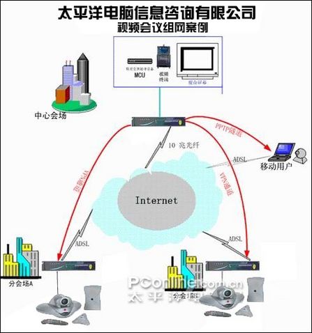 該方案有很強的針對性,作為主會場必須用10兆/20兆光纖接入INTERNET,且需要視頻交換處理設備MCU,而太平洋電腦網(wǎng)本身就具備雄厚的服務器作為基礎(chǔ)。廣州總公司還需要較高配置的視頻終端設備,在局域網(wǎng)網(wǎng)關(guān)上安裝較高配置路由器,主會場可以通過設置MCU隨時使某一分會場成為主席。