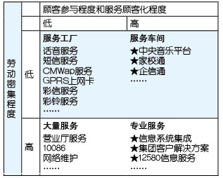 表1中以“★”標(biāo)識的服務(wù)基本上都是電信運(yùn)營企業(yè)開展移動信息化后向客戶提供的服務(wù),可以明顯看出,更高的顧客參與度、更多的顧客化是這些服務(wù)的共同特點,所以,移動信息化運(yùn)營的就是由服務(wù)工廠向服務(wù)車間轉(zhuǎn)型、由大量服務(wù)向?qū)I(yè)服務(wù)轉(zhuǎn)型。