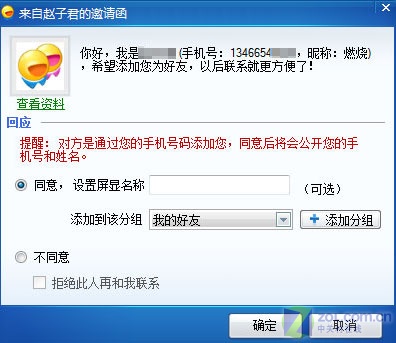 在圖3中,用戶在確認(rèn)好友發(fā)來的信息時,為避免好友過多而忘記對方的身份,可以直接在上圖中增加類似QQ和MSN的“備注信息”,也即“屏顯名稱”。