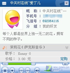 你可以點擊藍(lán)色文字鏈接,在彈出的窗口中單擊左下角的“播放/暫!卑粹o,以實現(xiàn)在PC機上聽好友彩鈴(如圖5)!這樣的功能其它IM軟件好像沒有,唯飛信才有的獨家功能!