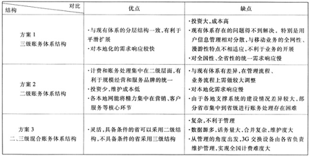 3G計費(fèi)賬務(wù)體系結(jié)構(gòu)主要分為三級賬務(wù)體系結(jié)構(gòu)、二級賬務(wù)體系結(jié)構(gòu)和二、三級混合賬務(wù)體系結(jié)構(gòu)等幾種方式。各種賬務(wù)體系結(jié)構(gòu)對比見表1。