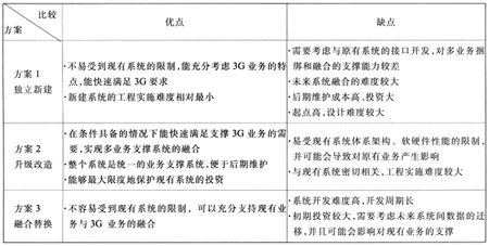 由于國內(nèi)電信運(yùn)營商一般已建有業(yè)務(wù)支撐系統(tǒng),因此在進(jìn)入到3G時代后就面臨著如何選擇3G融合計費(fèi)系統(tǒng)建設(shè)方式的問題。3G融合計費(fèi)系統(tǒng)的建設(shè)方案主要有獨(dú)立新建、升級改造、融合替換三種。三種不同的建設(shè)方案對比分析見表2。