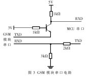(2)串行接口電路的設(shè)計。GSM模塊的串行口(UART)使用的不是標準的TTL電平,不能與控制它的MCU串口直接相連,在它們之間要有一個電平轉(zhuǎn)換接口電路。該電路要能實現(xiàn)模塊的3V高電平與