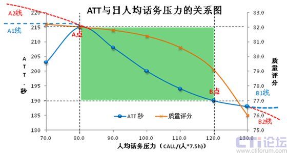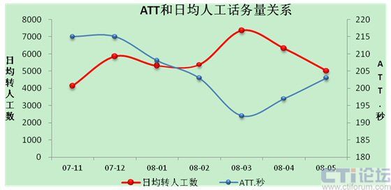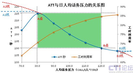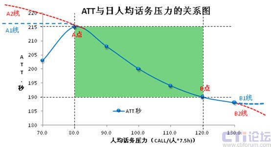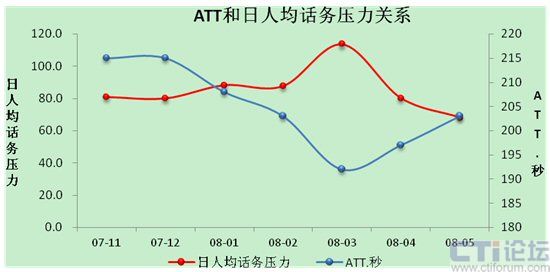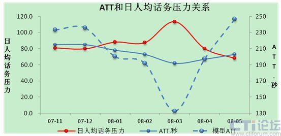 人均話務壓力在120以上,ATT也沒有依線性明顯縮小,而是在190秒處于一種平緩趨勢;