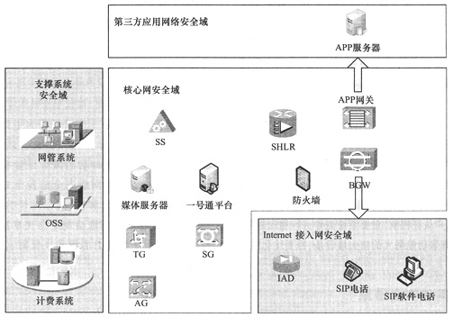 核心網(wǎng)安全域包括所有的軟交換機(jī),TG、AG、SG等接入網(wǎng)關(guān),BGW類設(shè)備,關(guān)鍵業(yè)務(wù)平臺(包括SHLR、號碼轉(zhuǎn)換平臺等),軟交換媒體服務(wù)器和應(yīng)用服務(wù)器,開發(fā)給第三方業(yè)務(wù)接口的應(yīng)用網(wǎng)關(guān)。Internet接入網(wǎng)安全域包括所有分配公網(wǎng)地址的SIP電話終端、IAD類設(shè)備、各類SIP接入的PC等。支撐系統(tǒng)安全域包括網(wǎng)管、計(jì)費(fèi)和OSS等輔助運(yùn)營系統(tǒng)。第三方應(yīng)用網(wǎng)絡(luò)安全域主要包括所有以開發(fā)業(yè)務(wù)接口方式接入的應(yīng)用服務(wù)器,鑒于目前實(shí)際應(yīng)用中很少涉及到這種應(yīng)用,這里不討論該區(qū)域的安全需求。