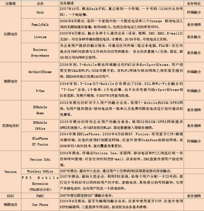 從全球范圍來看,大多數(shù)重要的固定運(yùn)營(yíng)商、移動(dòng)運(yùn)營(yíng)商和綜合性運(yùn)營(yíng)商都已經(jīng)開始或計(jì)劃提供各種形式FMC業(yè)務(wù)(見表)。其中大多數(shù)運(yùn)營(yíng)商提供捆綁業(yè)務(wù)和簡(jiǎn)單的融合業(yè)務(wù),而歐美的一些頂尖運(yùn)營(yíng)商已推出基于融合終端的FMC業(yè)務(wù)。