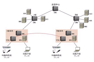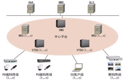 單級系統(tǒng)組網(wǎng)架構如上圖所示。主要包括前端單元PU、客戶端單元CU、中心平臺(包括CMU、VTDU、NRU)以及支撐系統(tǒng)(包括AAA、ULS和NMS),各部分均接入IP