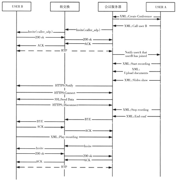 基于上述多媒體會議業(yè)務(wù)的實現(xiàn)流程,圖3給出了一個多媒體會議業(yè)務(wù)典型應(yīng)用的信令流程,具體包括對于用戶創(chuàng)建會議、邀請與會成員、會議中的,文件演示、會議的錄制與會議的回放等信令流程的描述。