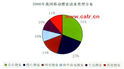 移動用戶的壯大,WAP市場的成熟和互聯(lián)網(wǎng)搜索服務(wù)的普及為中國移動搜索產(chǎn)業(yè)帶來了發(fā)展機會。尤其是獨立WAP的興起極大地豐富了移動的內(nèi)容,使得移動搜索服務(wù)成為移動互聯(lián)網(wǎng)用戶上網(wǎng)的必要手段。2004年,我國移動搜索業(yè)務(wù)開始啟動,一些增值業(yè)務(wù)提供商開始進入移動搜索行業(yè)。圖1 2006年我國移動搜索請求類型分布